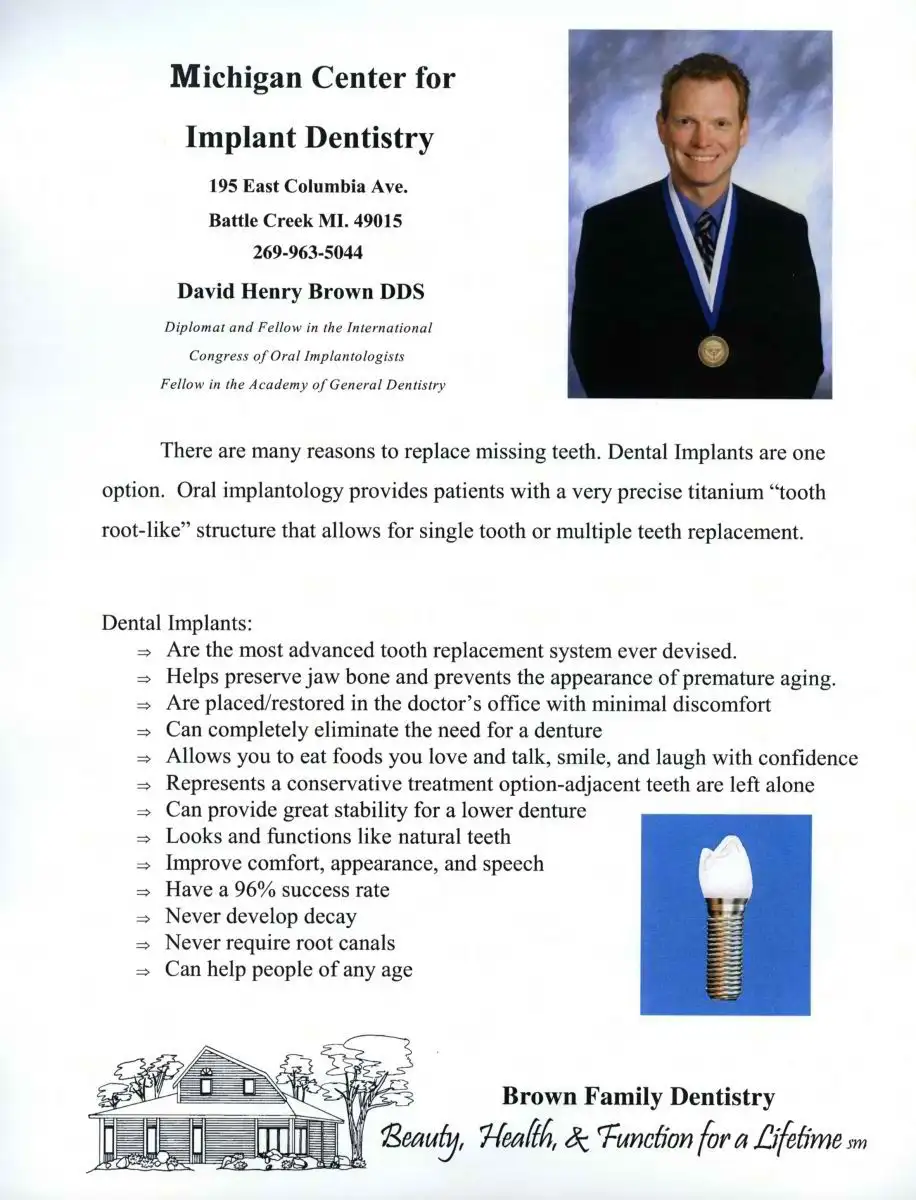 Before development of dental implants, dentures were the only alternative to replacing a missing tooth or teeth. Implants are synthetic structures that are placed in the area of the tooth normally occupied by the root. Implants are anchored to the jawbone or metal framework on the bone and act as a foundation for an artificial tooth or permanent bridge. In some cases, implants can be used to attach dentures. Not everyone is a candidate for a dental implant, however. For a successful implant to take hold, a candidate must have proper bone density and have a strong immune system. In all cases, dental implants require strict oral hygiene. Implants are so well designed that they mimic the look and feel of natural teeth. Implants are usually made of a synthetic yet biocompatible material like metal or ceramic. Surgery is necessary to prepare the area for an implant and place the implant in the mouth. Following the procedure, a period of time is required for the implant to take hold and for bone tissue to build up and anchor the device. In some cases, metal posts are inserted into the implant during a follow-up procedure to connect the tooth. Because implants require surgery, patients are administered anesthesia and, if necessary, antibiotics to stave off infection following the procedure.